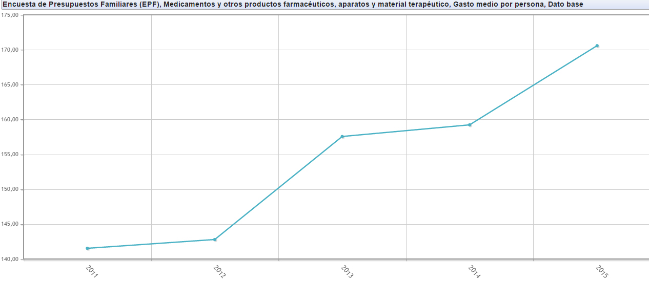 Así lo indican datos del Instituto Nacional de Estadística (INE), en los cuáles se analiza la evolución del gasto en los hogares españoles, un entorno en el que la inversión en productos farmacéuticos aumentó en 2015 unos 27 euros. De hecho, es el quinto gasto que más han aumentado las familias españolas, solo por detrás de comidas y bebidas fuera del hogar, productos alimenticios, compra de vehículos y bienes y servicios para el hogar.