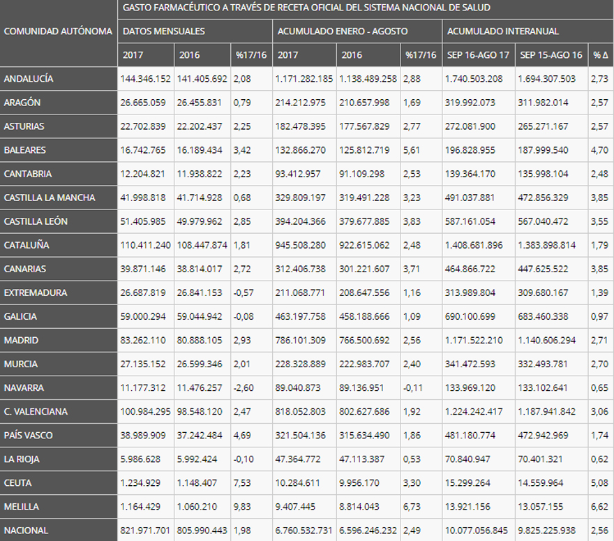 inversión en medicamentos de receta con cargo al Sistema Nacional de Salud (SNS) aumentó en agosto un 1,98 por ciento respecto al mismo periodo de 2016. En total, el gasto farmacéutico sumó unos 821.971.701 euros.