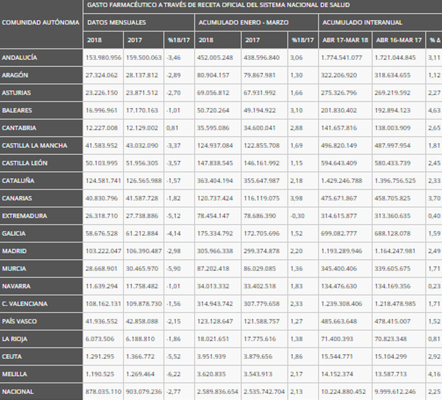 Evolución del gasto farmacéutico de marzo de 2018. Fuente: Ministerio de Sanidad.