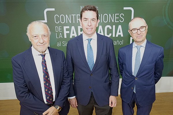 Juan Pedro Risquez, vicepresidente del Consejo General de Colegios de Farmacéuticos y presidente del Colegio Oficial de Farmacéuticos de Jaén; José Martínez Olmos, exsecretario general de Sanidad del Ministerio de Sanidad; y Rafael Borrás, director de Comunicación y Relaciones Institucionales de Teva.