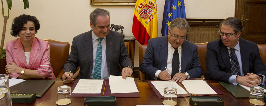 Encarnación Cruz Martos, directora general de Cartera Básica del SNS y Farmacia del Ministerio de Sanidad; Jesús Aguilar, presidente del Consejo General de Farmacéuticos; Juan Ignacio Zoido, ministro del Interior, y Gregorio Serrano, director general de la DGT, durante la firma del convenio.