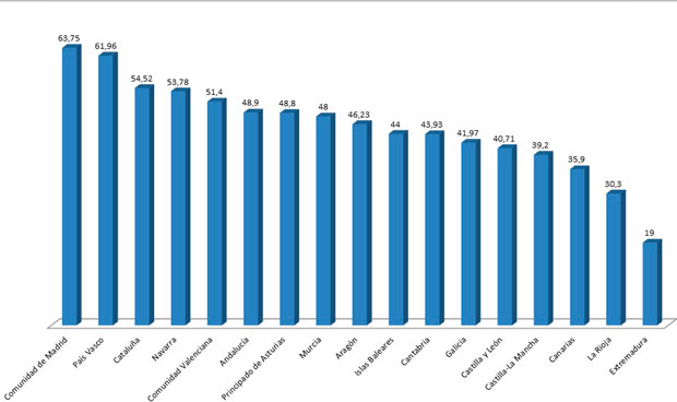 Al otro extremo de la tabla están Madrid y País Vasco, siendo las únicas que superan el 60 por ciento de asignación, con una media respectiva de 63,75 y 61,96 por ciento, lo que les convierte en las autonomías con menor disponibilidad, ya que solo quedan 448 plazas (36,25 por ciento) en la capital y 105 (38,04 por ciento) en el País Vasco. A pesar de sus altos resultados, no son las únicas por encima de la media del 50,98 por ciento.