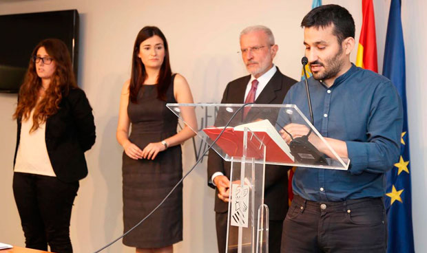 Los consejeros de Sanidad y Educación, Carmen Montón y Vicent Marzà, junto a Esteban Morcillo, de la Conferencia de rectores de las universidades públicas; y Andrea García del CEEM.