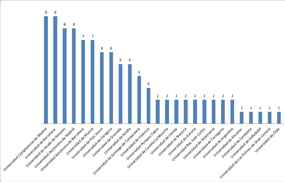 En un punto intermedio se han encontrado la Universidad de Zaragoza y País Vasco (con seis cada uno); Sevilla y Granada (con cinco cada una) y Santiago de Compostela, con cuatro estudiantes. Entre aquellas con menor representación se encuentran la Universidad de Valencia (con tres estudiantes); Universidad de Navarra, Gerona, Pompeu Fabra, Lleida, Salamanca, Castilla-La Mancha, Rey Juan Carlos, Reus y la Universidad de Argentina (con dos estudiantes); y Cantabria, Las Palmas, Alicante, Valladolid y la Universidad de Chile (con un estudiante).