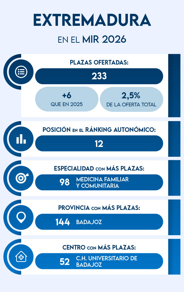 233 plazas, todas de titularidad pública, de Extremadura en el MIR 2026 hacen de ella la 12ª región en capacidad de acogida de nuevos residentes. Esta cifra, que supone un 3% de las