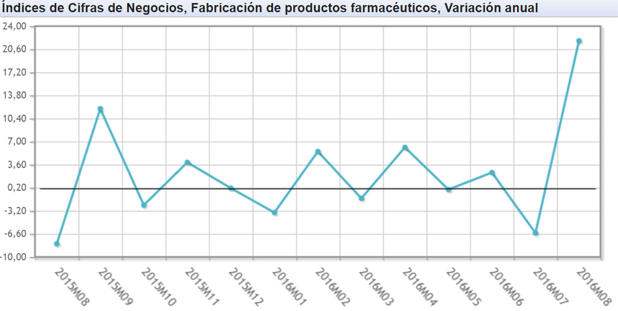 Concretamente, la cifra de negocio del sector de los fabricantes de productos farmacéuticos creció en agosto un 21,8 por ciento respecto al mismo periodo de 2015, según el Instituto Nacional de Estadística (INE), un incremento fundamentado tanto el crecimiento del mercado de oficina de farmacia como del gasto farmacéutico público, ambos en dobles dígitos. Muy por encima del conjunto de la industria española, cuya facturación creció un 6,6 por ciento.