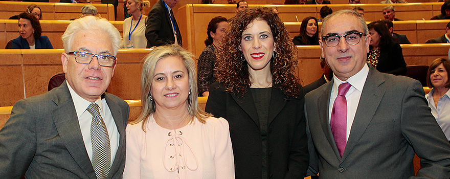 Ángel Luis Rodríguez de la Cuerda saluda a Carmen Aragón, presidenta de la Comisión de Sanidad del Senado. A continuación, Amelia Avilés, secretaria técnica de Aeseg, y Eladio González Miñor, presidente de Fedifar. |