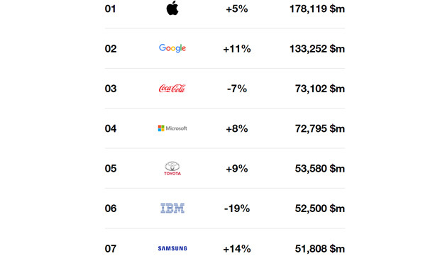 Los primeros siete clasificados del ranking de Interbrand, en millones de dólares.
