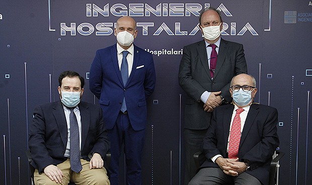 Alejo Joaquín Miranda, director general de Infraestructuras Sanitarias del Sermas; Luis Mosquera, presidente de la Asociación Española de Ingeniería Hospitalaria (AEIH); Javier Godoy Pallarés, director de Carburos Médica; y Martín, vocal de la Asociación Española de Ingeniería Hospitalaria.Herrero, en el VII Encuentro Global de Ingeniería Hospitalaria.