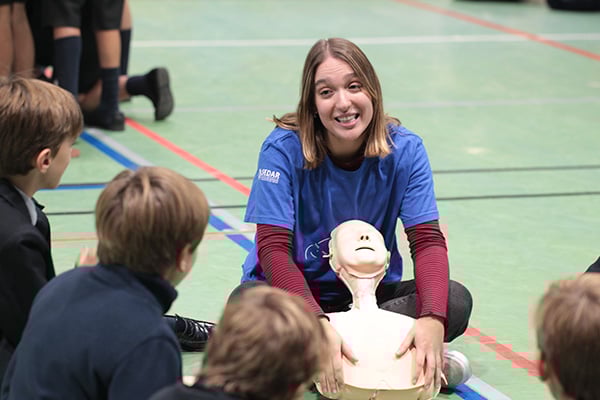 Médico MIR explicando a los niños las maniobras de reanimación cardiopulmonar.
