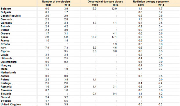 Número de oncólogos, centros de día y unidades de radioterapia por cada 100.000 habitantes. Fuente: Eurostat.