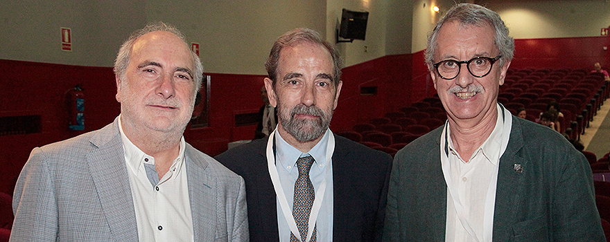 Fernando Chacón Fuertes, vicepresidente primero del Consejo General de la Psicología; Francisco Santolaya Ochando, presidente del Consejo General de Colegios de Psicología; y Juan Hermoso, coordinador de la división de Psicología del Centro Cardenal Cisneros, durante la inauguración de las III Jornadas Nacionales de Psicoterapia. |