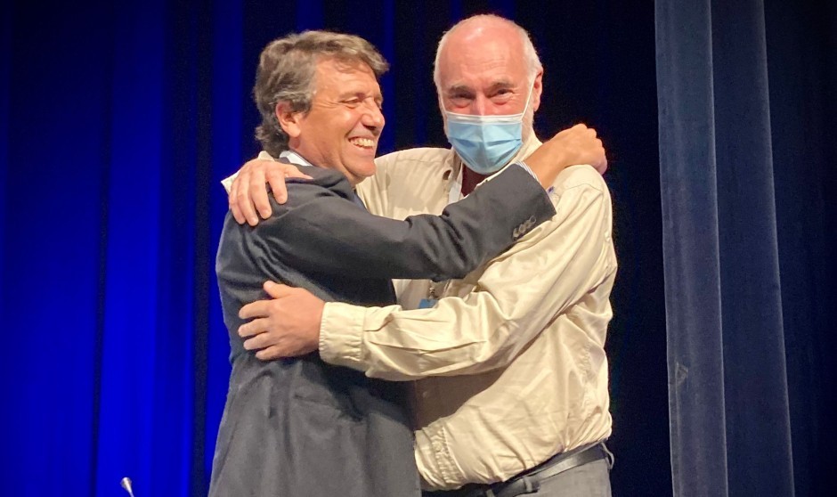 Momento en el que Celso Arango (izq) y Victor Pérez Sola (dch) anuncian la fusión de la SEP y la SEPB en la Sepsm.