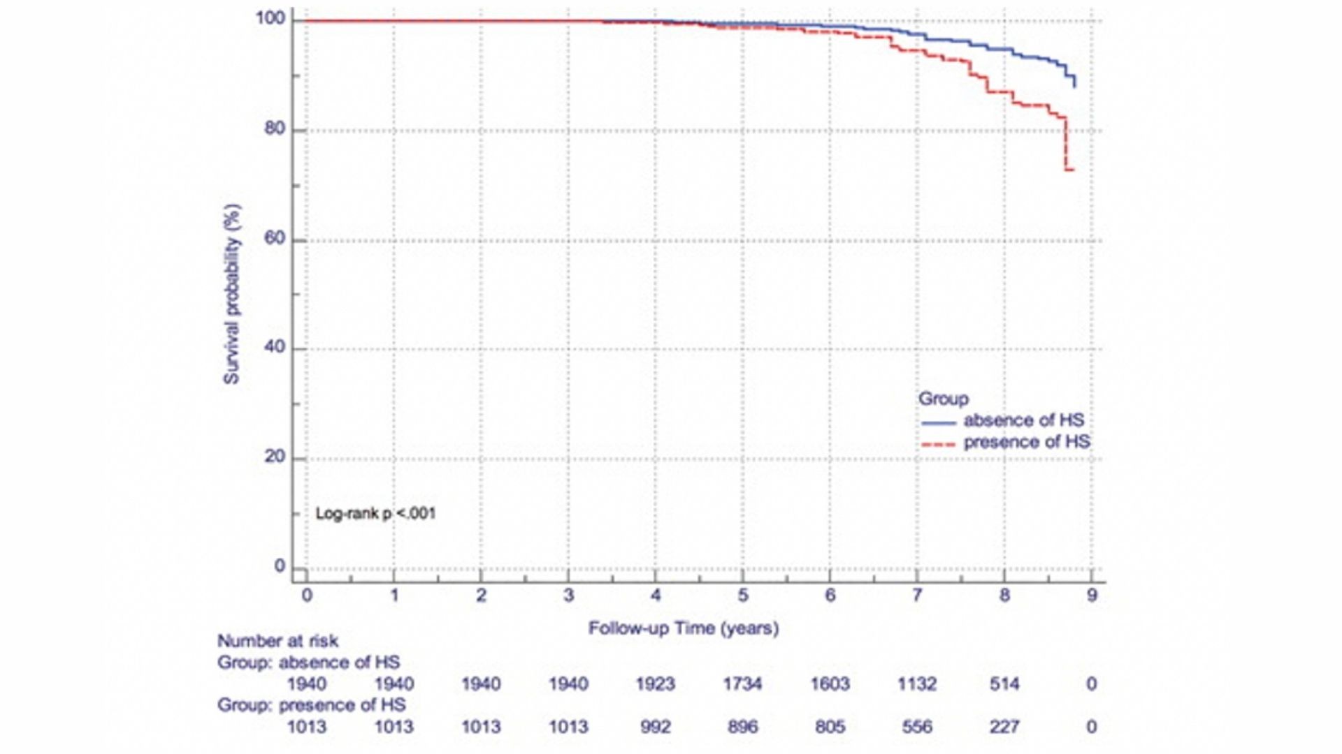 Se incluyeron 1.013 participantes con esteatosis hepática y 1.940 participantes sin la patología que completaron el seguimiento (edad media, 66 años ± 10 [desviación estándar] [rango, 29-90 años]; 1.940 hombres). Durante una mediana de 7,2 años de seguimiento (rango intercuartílico, 6,3-8,1), se observaron eventos cardiovasculares adversos mayores en 96 de 1.013 participantes con esteatosis hepática (10 por ciento), mientras que 80 de 1.940 participantes, sin esteatosis hepática (4 por ciento), tenían eventos cardiovasculares adversos mayores.