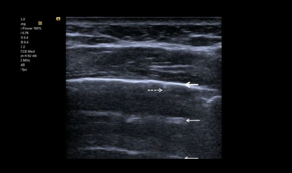 La ecografía torácica puede hacer una contribución sustancial, ya que permite el examen directo de cabecera del pulmón y el espacio pleural. Estos pacientes muestran neumonía intersticial bilateral difusa, con lesiones irregulares y parcheadas distribuidas principalmente en la periferia del pulmón”, explican los autores en un artículo publicado en