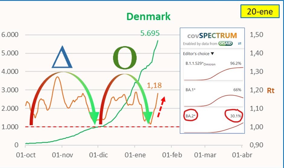 "Algo horrible se cuece en Dinamarca. La tasa de contagios rebota con fuerza tras Ómicron. Eso requiere nuevas condiciones: clima no es, medidas tampoco, sólo queda... nueva variante. Ya tienen un 30 por ciento de BA.2". Este es uno de los ejemplos de comentarios que investigadores y expertos han realizado en las últimas horas tras analizar los datos de cada variante covid en el país europeo.