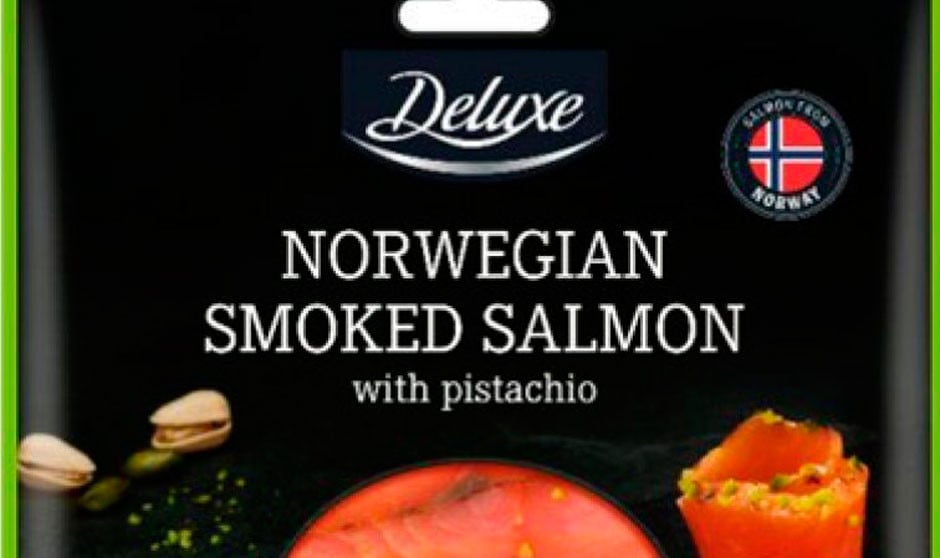 Salmón ahumado noruego con pistacho de la marca Deluxe. El producto, que se comercializa envasado en paquetes de plástico de 100 gramos, es distribuido por