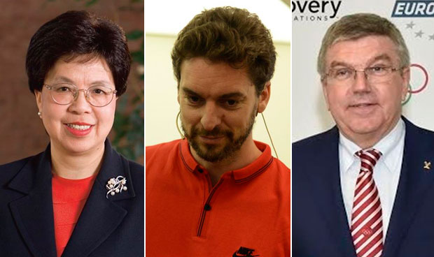 Margaret Chan, directora general de la OMS; Pau Gasol; y Thomas Bach, presidente del COI.