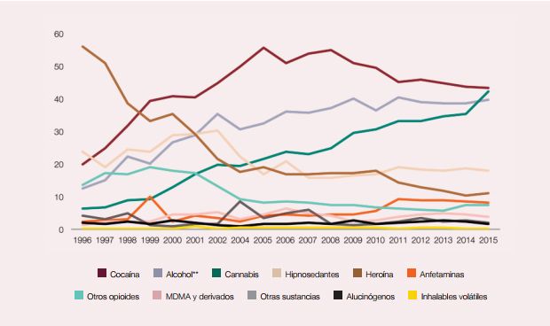 Además, se trata de la única sustancia cuya relación con las atenciones de urgencias ha ido creciendo de forma exponencial desde finales de los noventa. De este modo, mientras que en 1996 apenas estaba presente en el seis por ciento de las historias clínicas, en 2015 estuvo relacionada con el 42,2 por ciento. Asimismo, si se observa su curva de crecimiento, éste sólo se ha estancado en 2002, 2007 y 2012, pero en ningún momento ha remitido, como sí ha ocurrido con el resto de drogas.