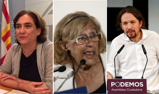 Ada Colau, alcaldesa de Barcelona; Manuela Carmena, regidora madrileña y Pablo Iglesias, líder de Podemos