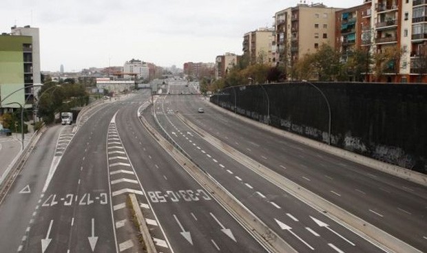 La avenida Meridiana de Barcelona, sin tráfico por el confinamiento,
