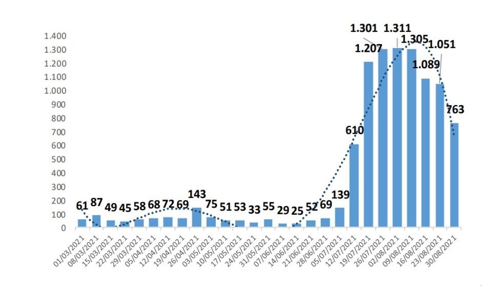 La mejora en la incidencia se ha traducido en un retroceso del número de contagios y fallecidos. En la semana del 30 de agosto al 5 de septiembre se han detectado