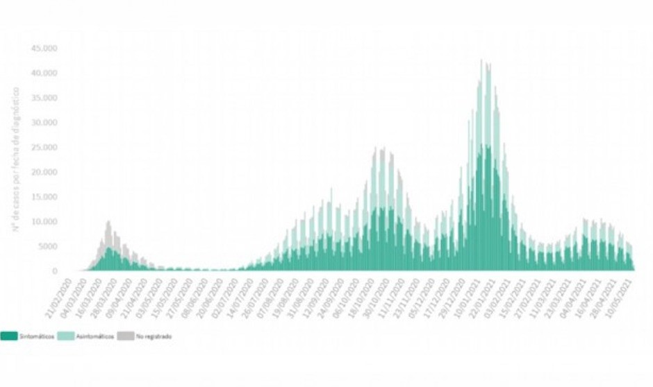 En relación a las pruebas diagnósticas, entre el 8 y el 14 de mayo las comunidades autónomas han realizado 762.262 pruebas, de las cuales más de medio millón han sido PCR y 256.538 test de antígenos, lo que sitúa la tasa global en 1.620 pruebas diagnósticas por 100.000 habitantes.