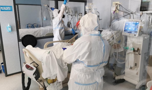 Un sanitario atiende a un paciente por Covid-19 en UCI.