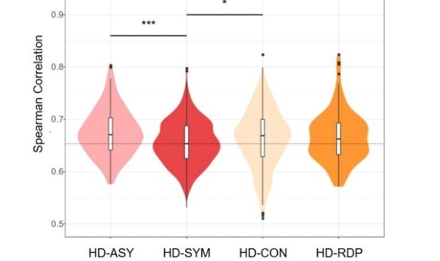 Coeficientes de correlación de Spearman de los perfiles de combinación que muestra una fuerte correlación entre los grupos de reinfección (RDP) y asintomáticos (ASY)