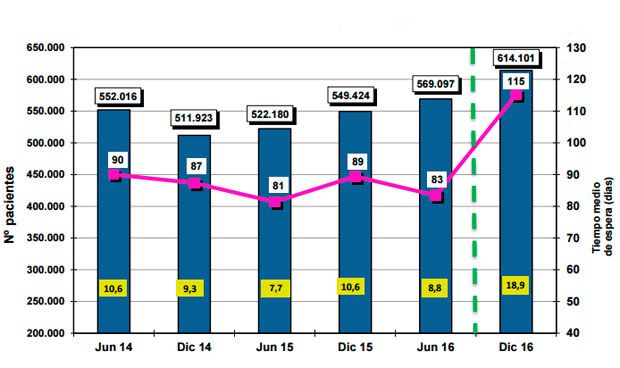 la lista de espera quirúrgica por especialidades médicas ha subido en 45.004 personas en el último semestre, o lo que es lo mismo, actualmente hay 13,65 pacientes esperando por cada 1.000 habitantes (un 18,9 por ciento más que hace seis meses). En días, a finales de año un paciente debía aguardar 115 días para ser atendido, lo que supone un mes más (32 días) que en junio de 2016.