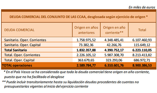 El peso de lo sanitario en este campo adquiere su verdadera dimensión al ponerlo en comparación con la cifra total de deuda comercial, que asciende 8.900 millones de euros. Es decir, prácticamente el 70 por ciento (69,72, concretamente) del endeudamiento de las comunidades autonómicas se corresponde con gasto sanitario. De él, el 29,44 por ciento tiene origen en años anteriores y 98,14 por ciento se corresponde con operaciones de naturaleza corriente.
