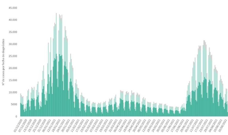 Entre el 9 y el 15 de agosto, las CCAA han realizado 850.601 pruebas diagnósticas, de las cuales 555.386 han sido PCR y 295.215 test de antígenos, con una tasa global por 100.000 habitantes de 1.808,78. La tasa total de positividad se sitúa en el 11,66 por ciento.
