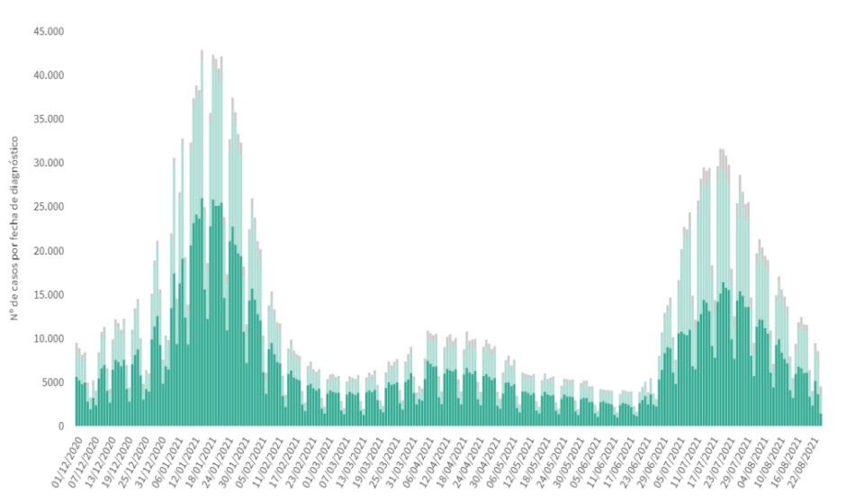 España suma 7.115 nuevos casos de Covid-19, 4.504 de ellos diagnosticados en las últimas 24 horas. En comparación con el mismo día de la semana anterior, nuestro país registró 12.445 positivos por la enfermedad. Y, en términos generales,