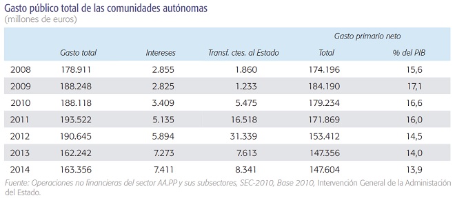Según los datos de Funcas, en 2011 las comunidades alcanzaron su techo histórico de gasto sanitario público, situándose en 193.522 millones de euros, mientras que en 2014 se gastaron 163.356 millones. En términos de PIB, el gasto de 2011 suponía un 16 por ciento mientras que el de 2014 fue del 13,9 por ciento.