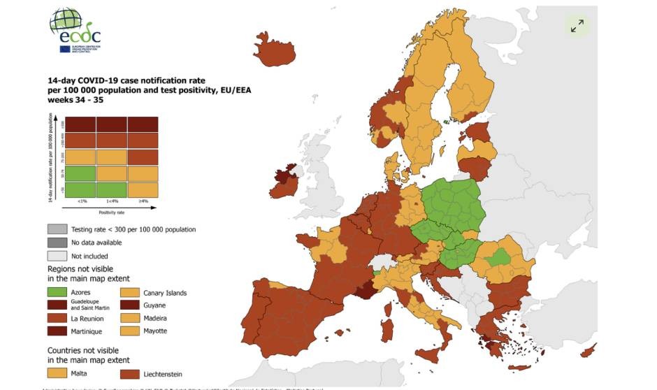 riesgo es más bajo en toda la Unión Europea. Solamente algunas zonas de Francia, Grecia e Irlanda están marcadas por el rojo oscuro, lo que significa que la tasa de notificación de casos Covid-19 acumulativa de 14 días en estos territorioes es de 500 o más.