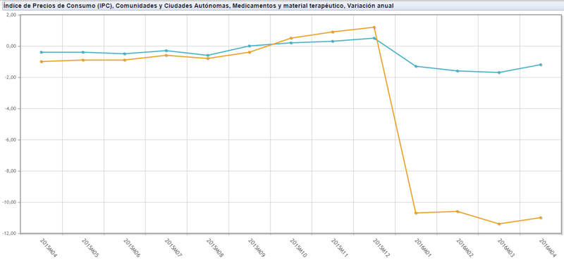 Por tanto, todo indica que es la Comunidad Valenciana la que está arrastrando a que el IPC de los medicamentos haya caído un 1,2 por ciento en total en el pasado mes de abril, comparado con el mismo periodo de 2015. Y todo parece indicar que la causa está en el efecto de las subvenciones que está aplicando la Generalitat levantina para diluir el efecto del copago farmacéutico en pensionistas y pacientes con diversidad funcional. Solo en enero, primer mes de aplicación de esta medida, el precio de los medicamentos cayó un 10,7 por ciento respecto al mismo periodo del año anterior. En febrero se redujo un 10,6 por ciento y en el pasado mes de marzo el decrecimiento alcanzó su máximo con un 11,4 por ciento. Y todo ello a pesar de que este indicador habría registrado aumentos en esta región hasta diciembre.