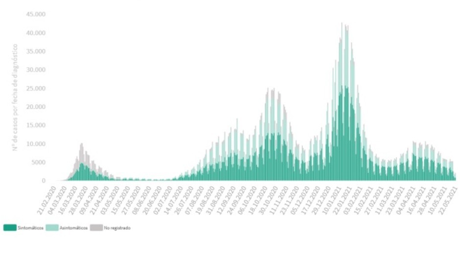 De las 2.100 personas diagnosticas de Covid-19 en el último día, 806 se han localizado en Madrid, si bien 104 en Andalucía, 125 en Aragón, 35 en Asturias, 12 en Baleares, 90 en Canarias, 43 en Cantabria, cinco en Castilla-La Mancha, 221 en Castilla y León, 70 en Cataluña, 24 en Comunidad Valenciana, 77 en Extremadura, 46 en Galicia, 20 en Melilla, 68 en Murcia, 53 en Navarra, 259 en País Vasco y 42 en La Rioja.