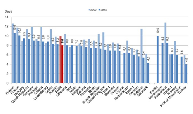 datos que ha publicado la OCDE. En concreto, mientras que la media de la Unión Europea de los 28 está en 8 días, en España ese dato se reduce hasta los 7,4 días.