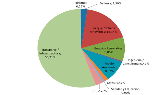 Distribución de la cuota de negocio por licitaciones en el extranjero por sectores. Fuente: Ministerio de Economía.