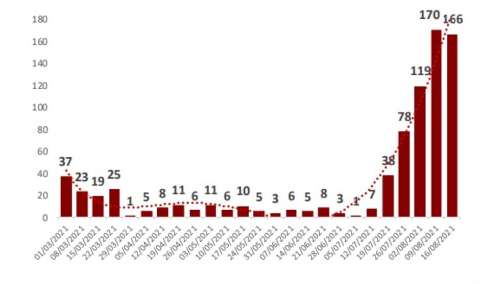 250 de la semana anterior a los 157 registrados entre el 16 y 22 de agosto.
