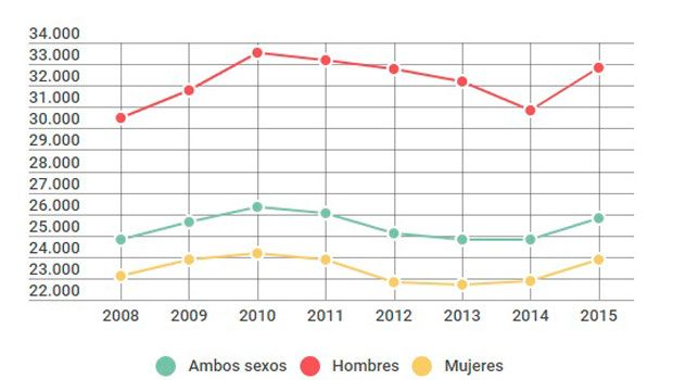 Instituto Nacional de Estadística (INE). Son casi 1.000 euros más al año que los 24.837 euros que cobraban en 2008. Las mujeres han aumentado 800 euros su salario base, pero no llegan ni siquiera a la media y la brecha salarial respecto a lo que cobran los hombres se ha acrecentado.
