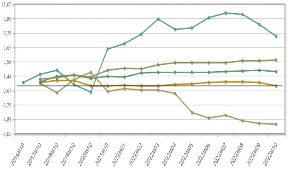 máximas mensuales del 0,2 por ciento registradas en abril y junio. La mínima del -0,5 por ciento de este octubre coincide con la que se registró en el mismo periodo de 2021.