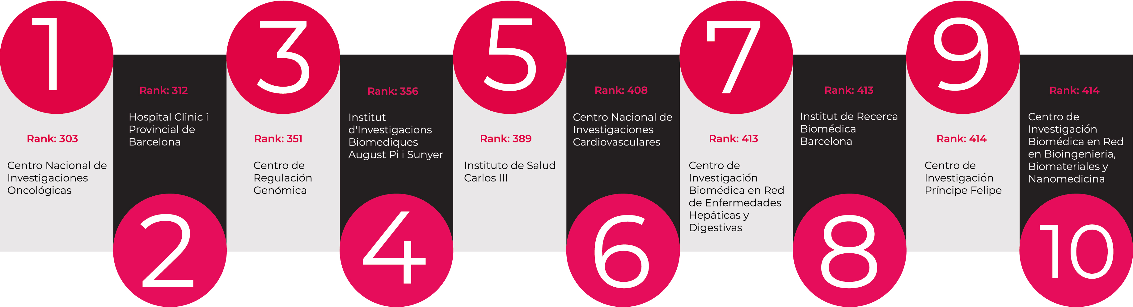 Instituto de Salud Carlos III y que están presentes en la clasificación de los 50 centros ocupando primeros puestos (el Instituto de Salud Carlos III en quinto lugar, el Centro Nacional de Investigaciones Cardiovasculares en en sexto, el Centro de Investigación Biomédica en Red de Enfermedades Hepáticas y Digestivas en séptimo y el Centro de Investigacion Biomédica en Red en Bioingeniería, Biomateriales y Nanomedicina en décima posición).