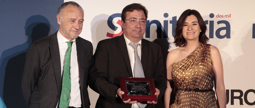 José María Pino, presidente de Sanitaria 2000; Guillermo Fernández Vara, presidente de la Junta de Extremadura, y Carmen Montón.