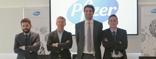 De izquierda a derecha: Daniel García, presidente de la Federación Española de Hemofilia; Juan Álvarez, director médico de Pfizer; Xavier Velásco, director de la planta biotecnológica de Pfizer; y Víctor Jiménez-Yuste, jefe de la Unidad de Trombosis y Hemostasia del Hospital La Paz.