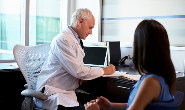 Un médico atiende a una mujer en su consulta de Atención Primaria.