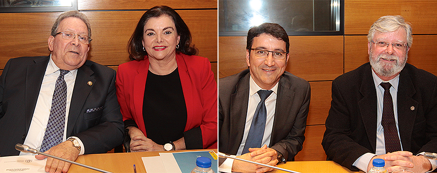 Jesús Aguilar, presidente del Consejo General de Farmacéuticos, y Juan José Badiola, presidente del Consejo General de Veterinarios. A continuación, Francisco de Paula y Ofelia de Lorenzo, secretaria del Consejo Asesor de Sanidad. |