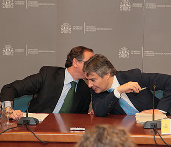 Alfonso Alonso, ministro de Sanidad (a la izquierda), habla con Rubén Moreno, secretario general de Sanidad.