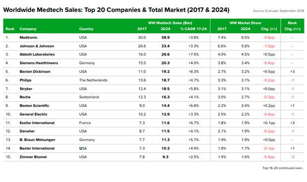 mayor subida en sus ventas, de entre las 10 primeras, pasando de los 11 mil millones a 19.200, un 8,3 por ciento, situándose en el quinto puesto de la tabla. Esta previsión se basa en la adquisición de CR Bard, lo que debería impulsar sus ventas.