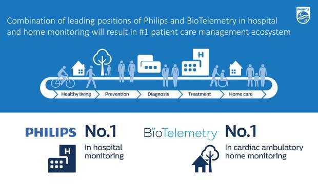 "La adquisición de BioTelemetry encaja perfectamente con nuestra estrategia de ser un proveedor líder de soluciones de gestión de la atención al paciente para el hospital y el hogar", ha declarado Frans van Houten, CEO de Royal Philips. “El liderazgo de BioTelemetry en un gran mercado en expansión como es el de diagnóstico y monitorización cardíaco ambulatorio complementa nuestra posición de liderazgo en el hospital. Aprovechando nuestra experiencia colectiva, estaremos en una posición óptima para mejorar la atención al paciente en todos los entornos de atención para múltiples enfermedades y afecciones", ha añadido Van Houten.
